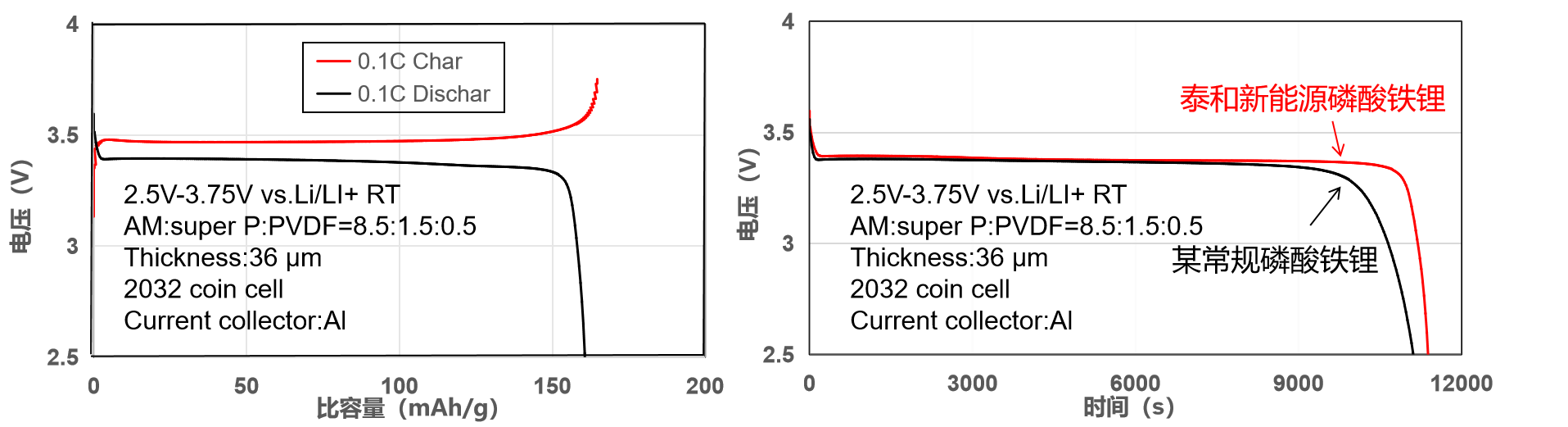 圖1扣電充放電曲線(xiàn) 圖2 扣電放電電壓曲線(xiàn)對(duì)比(0.1C)
